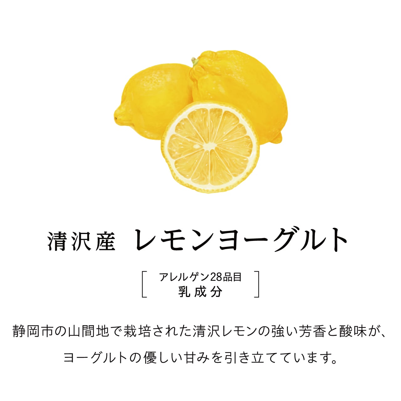 原材料名: ヨーグルト(乳成分を含む)(国内製造)、砂糖、レモン果汁(レモン(清沢産))/トレハロース、安定剤(増粘多糖類)