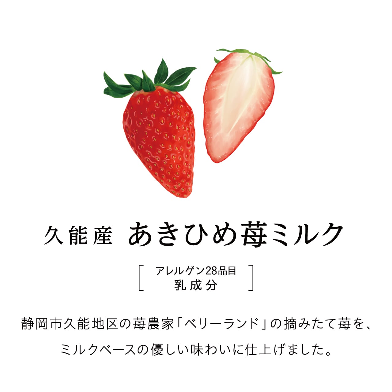 原材料名: 苺(静岡県産)、牛乳、砂糖、生クリーム、脱脂粉乳、ブドウ糖/トレハロース、乳化剤、安定剤(増粘多糖類)